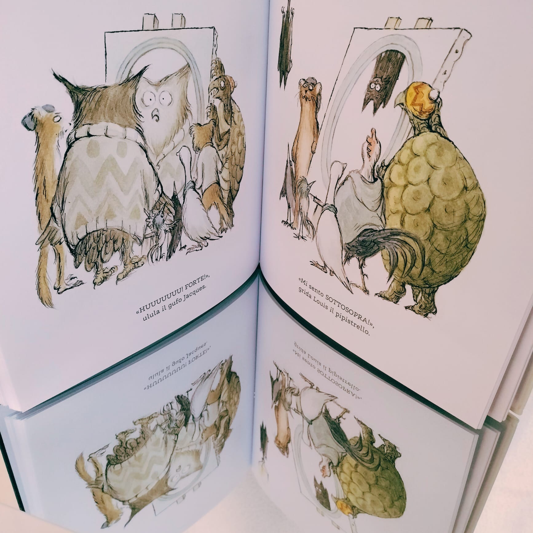 In questo caso lo sguardo obliquo e lo specchio si fondono per creare significati profondi. Lo specchio diviene il portale verso altri mondi/dimensioni, (un vero must della letteratura per l’infanzia) e lo sguardo obliquo rimanda così a una percezione distorta. Ovvero, rappresenta la capacità di vedere la realtà da un punto di vista diverso, svelando mondi nascosti e/o altre verità.